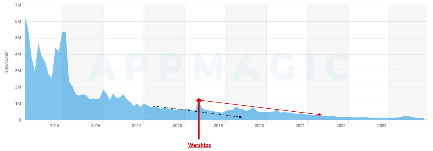 Quickly looking, AppMagic shows that while e.g., their Warships update successfully reinvigorated engagement couple years back — giving players a competitive mode and new objectives — this effect alone was not overall solution for them as overall the long-term engagement is back on slowing down.