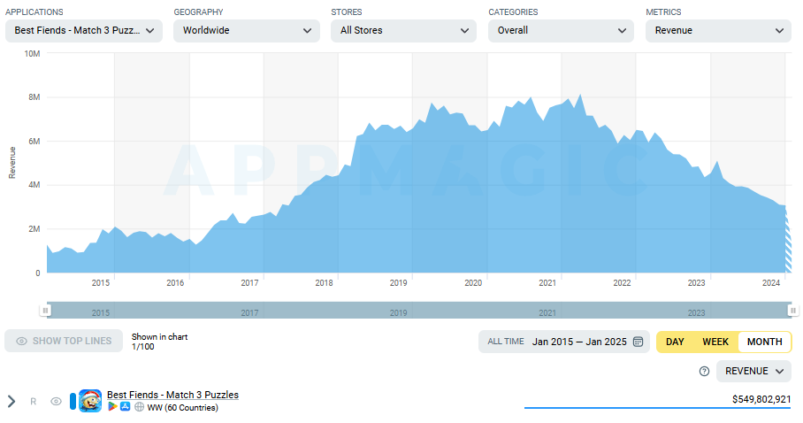 Best Fiends, Worldwide Revenue (Source: AppMagic). That's plenty of $ there but I think there is much more of it for others to take from the table with right product approaches.