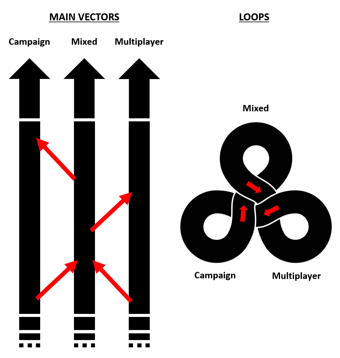 The above images — 1) three vertical vectors, and 2) three interconnected loops — illustrate the Campaign, Mixed, and Multiplayer modes and their interlinking red arrows, symbolizing this systems design approach.