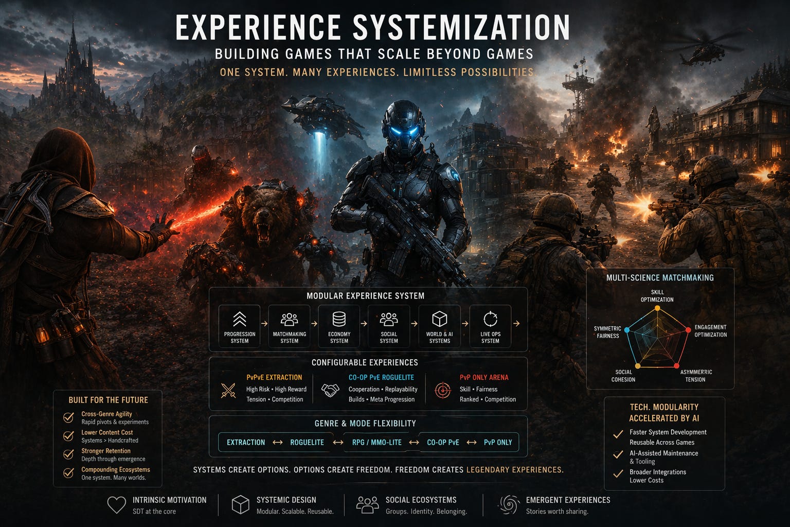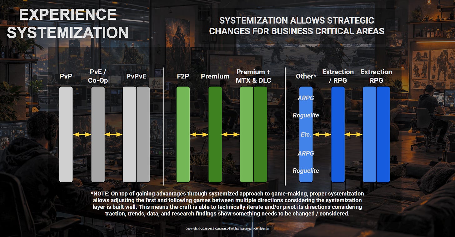 Experience systemization in a nutshell means that you are no longer designing a single game. You are designing an experience engine, which builds sustainability and scalability for your business in smart way.
